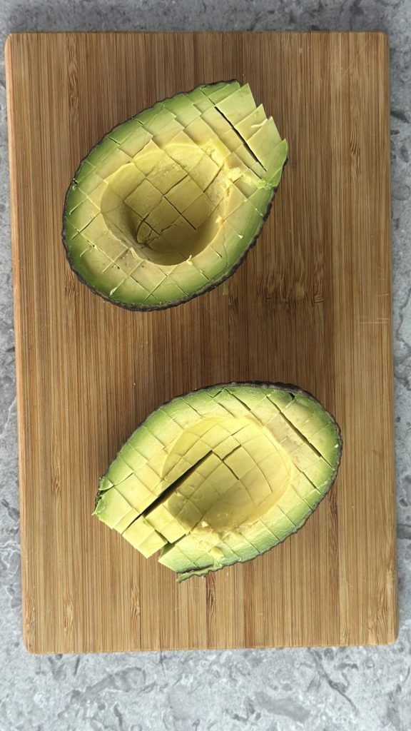 Sors la chair de l’avocat à la cuillère directement dans le bol avec le reste des ingrédients.