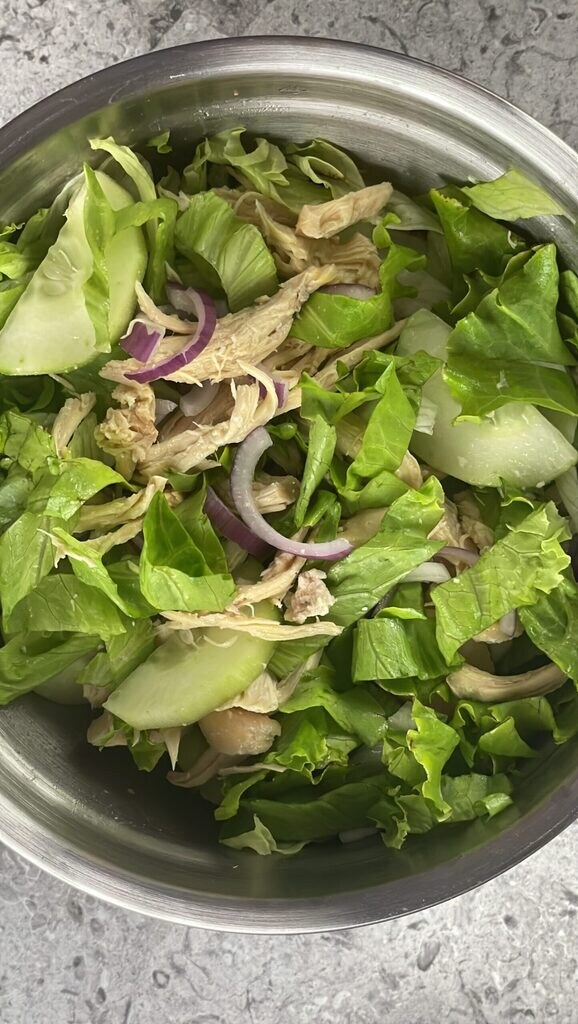 Assaisonnez la salade de poulet avec la vinaigrette au citron et mélangez bien le tout.