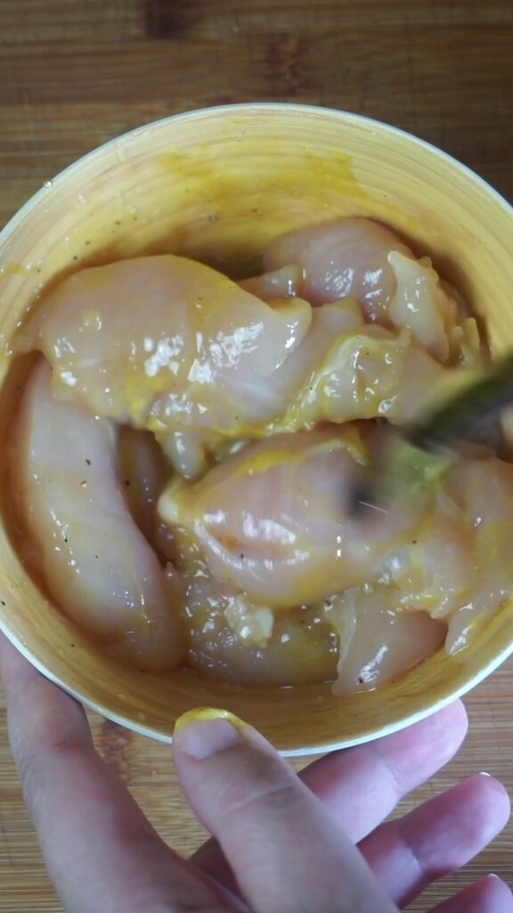 Utilisez 2/3 de l’émulsion pour mariner le poulet pendant 30 minutes au réfrigérateur.