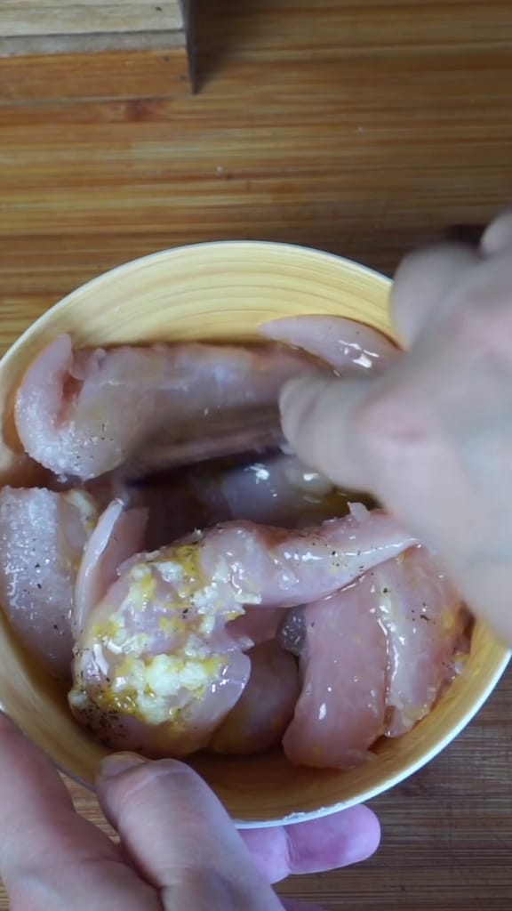 Commence la préparation de la salade de riz à la grecque en ajoutant à la poitrine de poulet le zeste d’un citron non traité, le jus d’un demi-citron, une gousse d’ail râpée, du sel, du poivre noir et de l’huile d’olive extra vierge. Laisse mariner au réfrigérateur pendant 30 minutes.