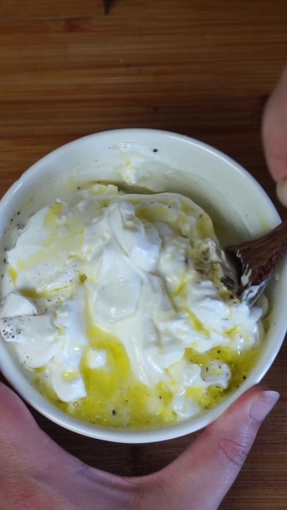 Prépare la sauce au yaourt : ajoute au yaourt grec le jus d’un demi-citron, une cuillère d’huile d’olive extra vierge, du sel et du poivre noir.