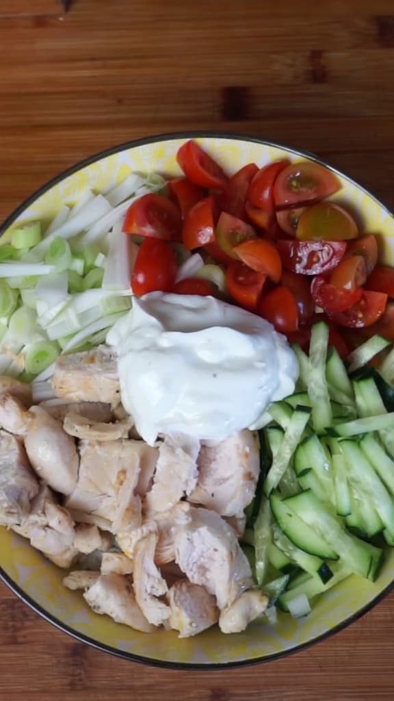 Salade de riz à la grecque, une version originale et différente de la salade de riz habituelle, l’une des recettes les plus cuisinées avec la belle saison. Dans cette préparation, j’ai décidé d’utiliser du riz basmati et de l’assaisonner avec une sauce au yaourt grec à la place de la mayonnaise classique. J’ai ensuite ajouté de la poitrine de poulet marinée, des tomates cerises, un oignon nouveau et des concombres. Un plat frais, complet, simple à préparer et naturellement délicieux !