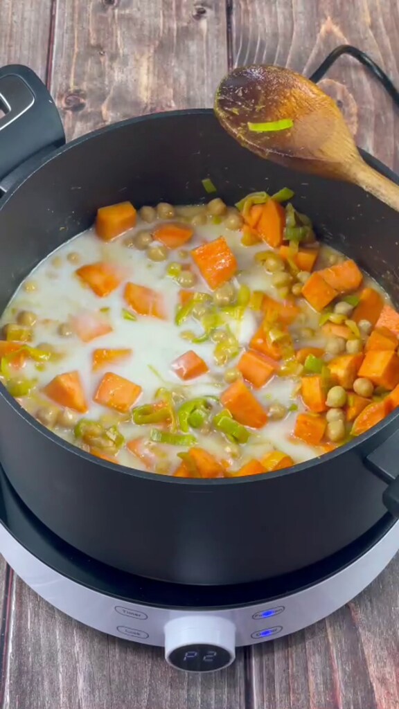 Cette soupe à base de pois chiches est enrichie de patates douces et de poireaux. Rehaussée par la pâte de curry, elle a un léger arôme de coco grâce à l’utilisation du lait de coco.