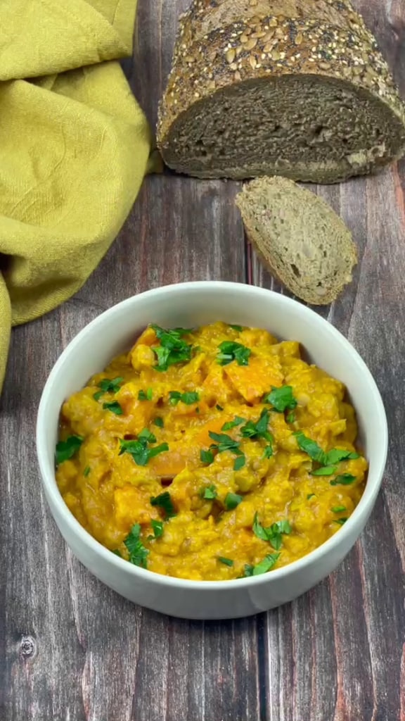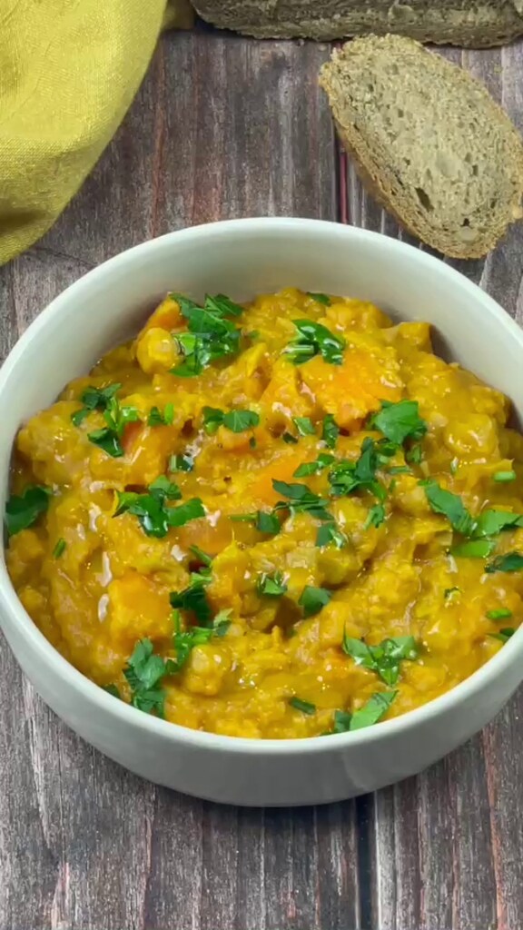Soupe de pois chiches et patates douces au curry, une recette simple, rassasiante et savoureuse qui s’inspire de la tradition culinaire indienne.