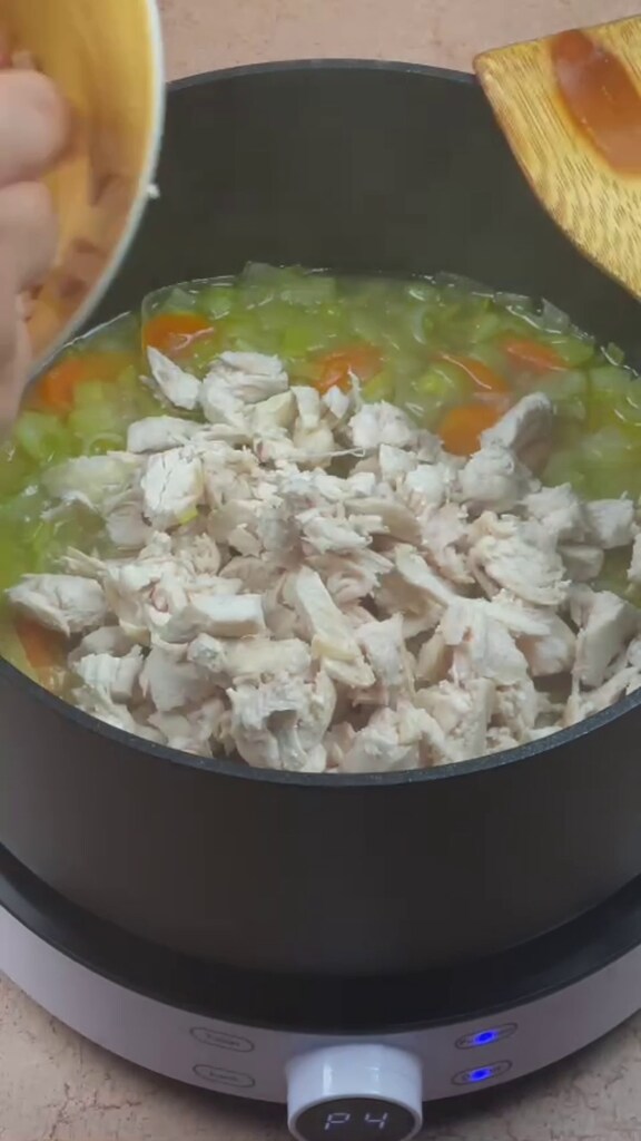 Laisse revenir pendant quelques minutes, puis ajoute le bouillon de poulet bouillant – tu peux aussi utiliser du bouillon de légumes – et fais cuire pendant une dizaine de minutes.