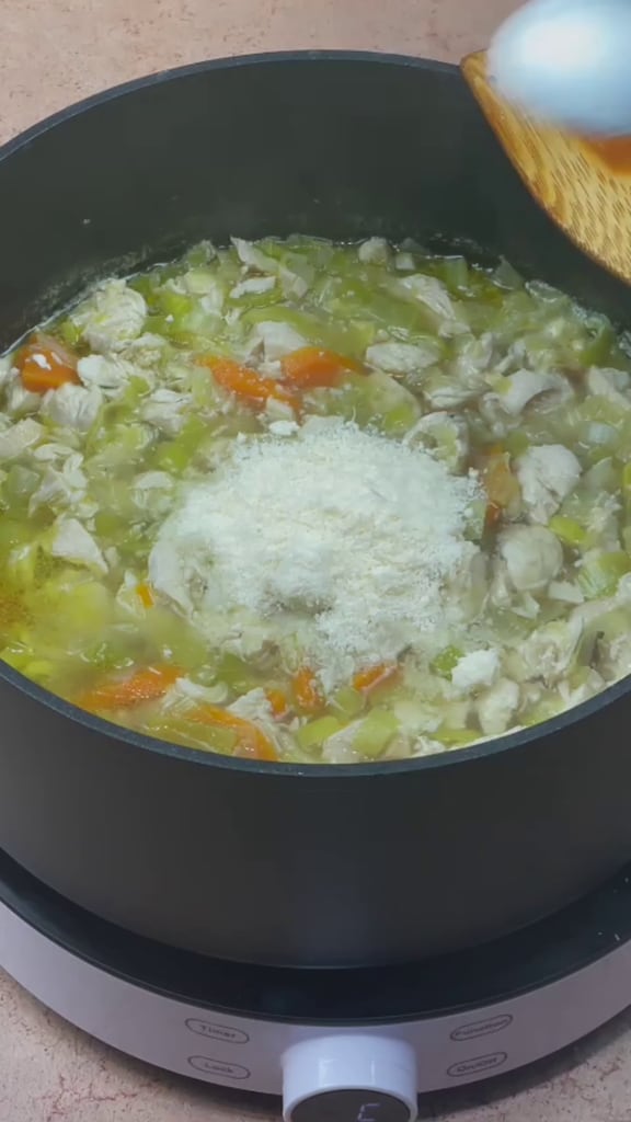 Une fois prête, assaisonne la soupe avec du parmesan râpé.