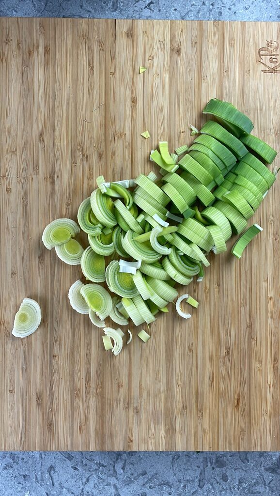 Laissez-les tiédir et ajoutez le poireau coupé en rondelles.