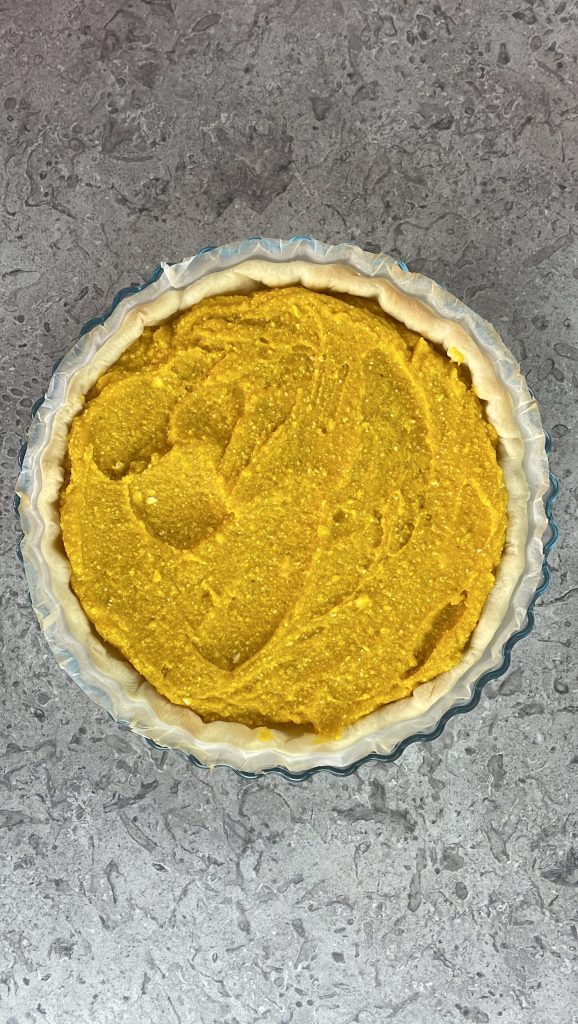 • Reprenez la pâte brisée et étalez uniformément la crème de courge et de feta.