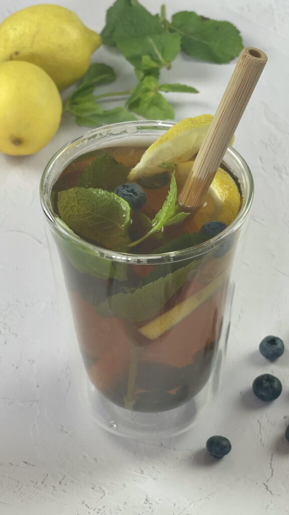 La base peut être du thé noir, vert ou blanc, selon les préférences. Chaque type de thé offre un profil de saveur unique et des bienfaits différents. Le citron ajoute une touche de fraîcheur et d’acidité à la boisson. Il est riche en vitamine C et en antioxydants, qui peuvent aider à renforcer le système immunitaire. Les myrtilles apportent une saveur douce-acidulée et sont connues pour leur haute teneur en antioxydants, en particulier les anthocyanes, qui peuvent aider à protéger les cellules des dommages oxydatifs.