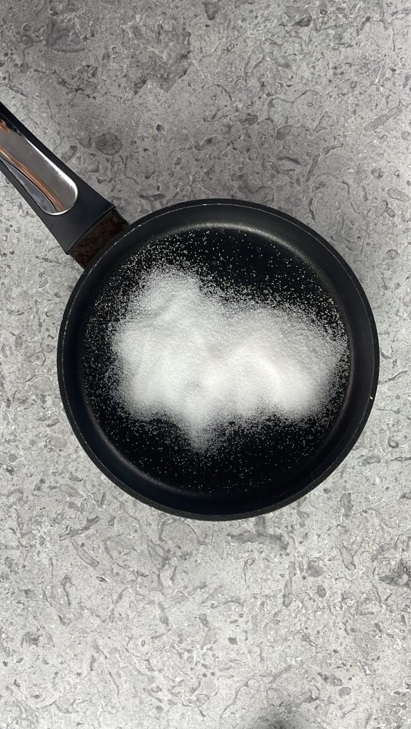 Préparez le caramel à sec en faisant fondre lentement le sucre dans une poêle à feu doux sans jamais le toucher avec la spatule.