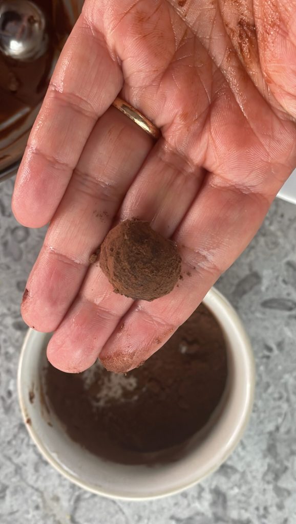 Formez les truffes : prenez une cuillère de ganache et façonnez-la rapidement avec vos mains pour lui donner une forme ronde.