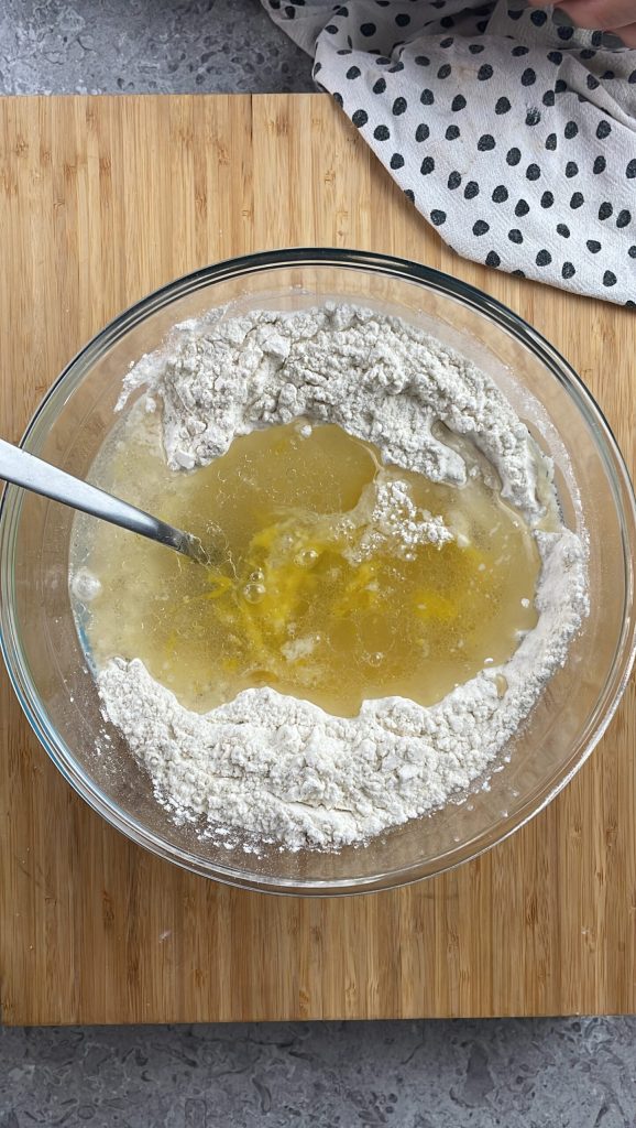 Poursuis la préparation en ajoutant l’œuf, le vermouth et l’huile et commence à pétrir d’abord avec une cuillère en bois ou une spatule puis avec les mains (ou tu peux utiliser un robot avec un crochet en spirale).Poursuis le travail de la pâte sur un plan de travail fariné jusqu’à obtenir une boule souple et non collante (si nécessaire, ajuste avec de l’eau ou de la farine).