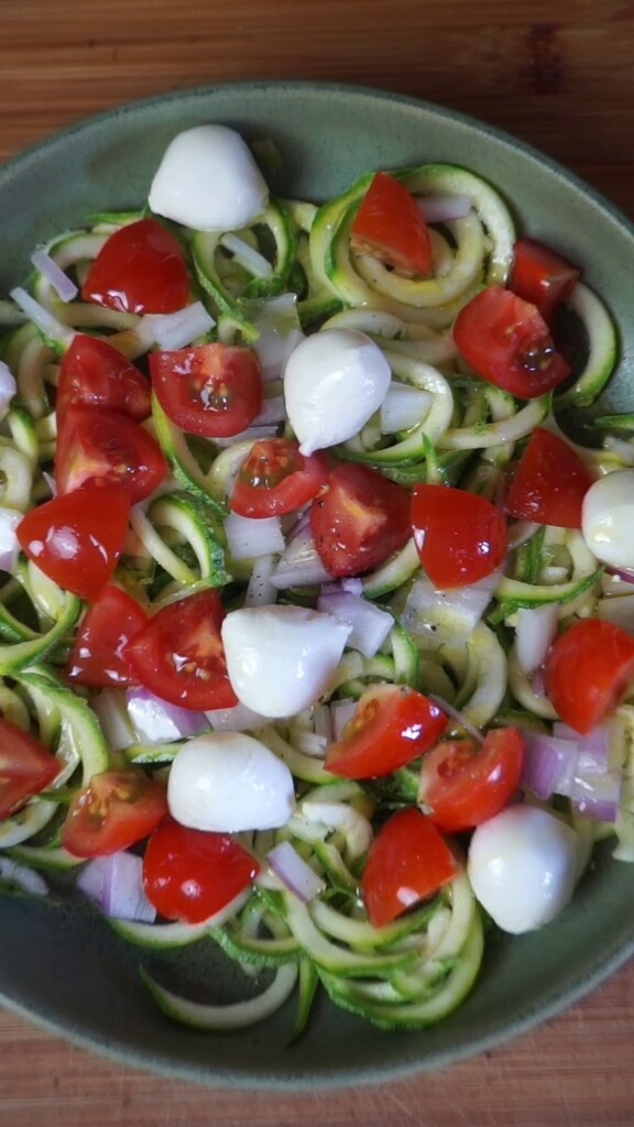 Les zoodles à la caprese sont une recette végétarienne très facile à réaliser et parfaite pour les jours chauds car sans cuisson. Ce sont des spaghettis de courgettes réalisés avec un spiraliseur ou une mandoline à julienne, assaisonnés avec des tomates cerises, de la mozzarella et de l’oignon rouge de Tropea. Très frais et délicieux, ils seront parfaits pour les déjeuners et dîners d’été ! Je sers généralement les zoodles comme plat unique mais ils conviennent aussi comme plat principal.
