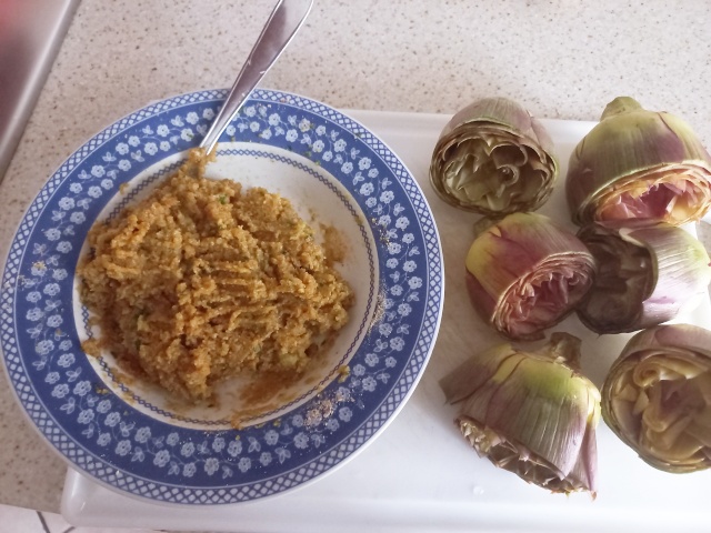 La préparation est vraiment simple. Tout d’abord, je nettoie les artichauts en enlevant les feuilles dures et le foin interne, puis je les laisse tremper dans de l’eau citronnée. Pendant ce temps, je prépare la farce en mélangeant de la mie de pain, du fromage râpé, de l’ail, du persil, des œufs et les tiges d’artichaut finement hachées. J’écarte bien les feuilles des artichauts, je les farcis avec le mélange et je les place debout dans une casserole. Enfin, j’ajoute un filet d’huile, un peu d’eau au fond et je fais cuire à feu doux avec le couvercle jusqu’à ce qu’ils deviennent tendres. Facile, non ?