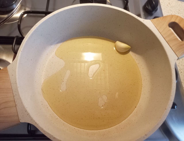 • Mettez dans une casserole 3 cuillères à soupe d’huile d’olive extra vierge et 1 gousse d’ail. Faites légèrement dorer l’ail.