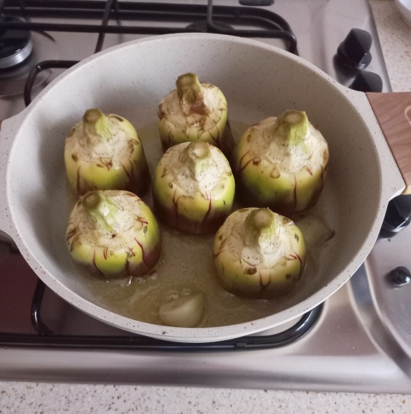 • Ensuite, ajoutez également les artichauts retournés et faites-les dorer.