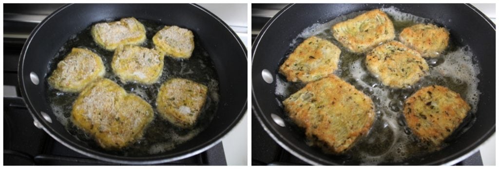 • Mettez sur le feu une poêle avec beaucoup d’huile d’olive extra vierge et faites chauffer. Dès que l’huile est chaude, faites frire les artichauts des deux côtés.