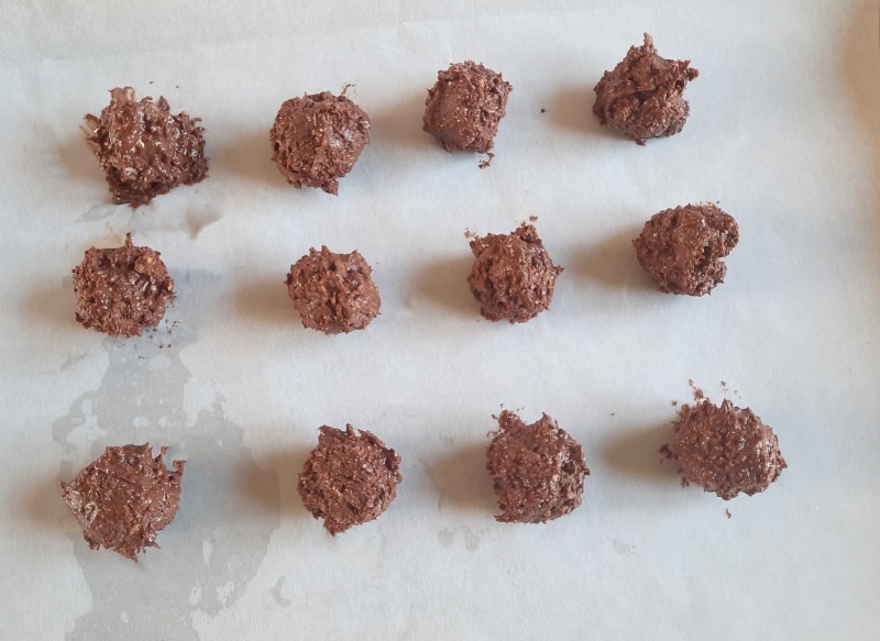 Tapissez une plaque de papier sulfurisé. À l’aide d’une cuillère, prélevez des petits tas de la préparation : ils doivent être à peu près de la taille d’une noix.