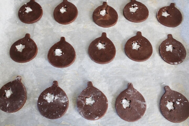• Ensuite, découpez les biscuits avec les emporte-pièces de votre choix et placez-les sur des plaques recouvertes de papier cuisson ; avec un emporte-pièce plus petit en forme de étoile, j’ai fait un trou sur la gauche.