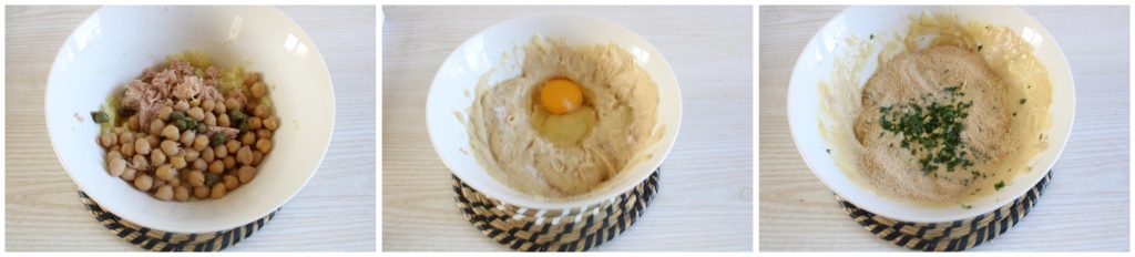 Égouttez bien le thon et mixez-le avec un mixeur plongeant avec les pois chiches (je les ai faits cuire pendant environ 5 minutes) et les câpres. Ajoutez les pommes de terre écrasées, l’œuf et la chapelure, le persil haché, salez et poivrez.
