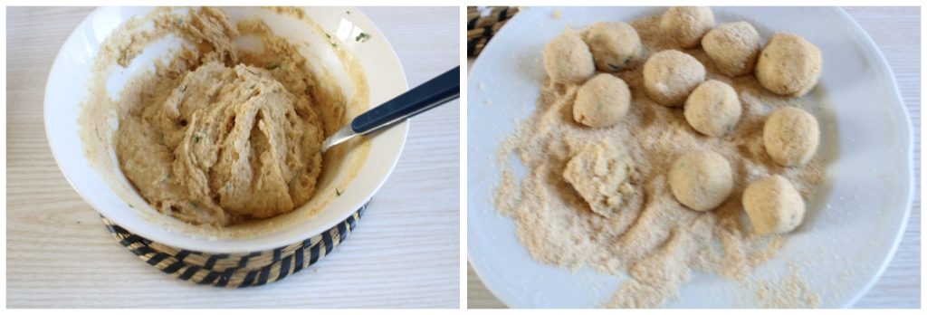 N.B.: ajoutez la chapelure une cuillère à la fois, en mélangeant bien. Si le mélange est trop mou, ajoutez-en encore. Pour moi, il a fallu 5 cuillères à soupe au total.