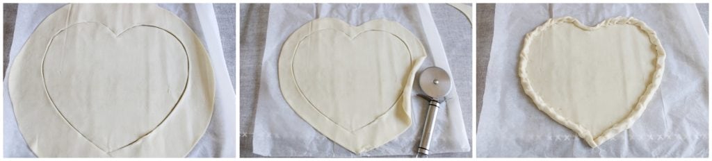 Sortez la pâte feuilletée du réfrigérateur et laissez-la à température ambiante pendant au moins 5 minutes, puis déroulez-la. Avec un couteau (ou une roulette à pizza), découpez la forme d’un cœur, puis à l’extérieur, découpez un bord d’environ 3 cm. et enroulez-le, en le pinçant avec les doigts.