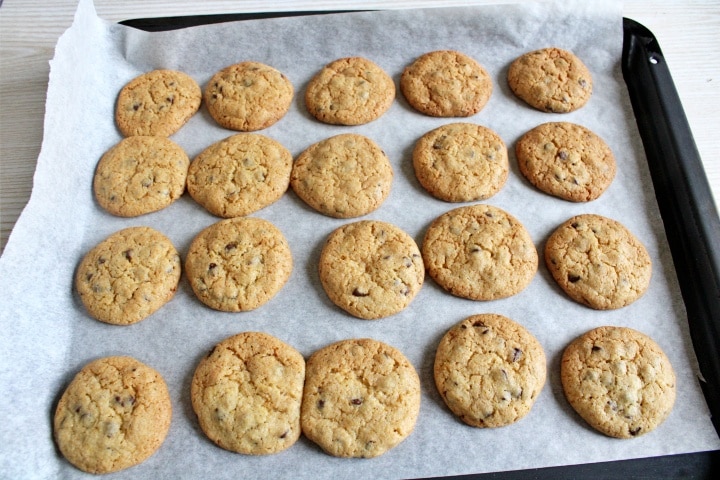 Enfournez dans le four déjà chaud pendant environ 10-15 minutes. Les cookies aux pépites de chocolat seront prêts lorsqu’ils auront atteint une belle coloration dorée.