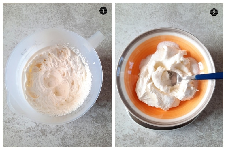 Ensuite, ajoutez la crème montée, mélangez délicatement le mélange et mettez-le dans une poche à douille avec une douille étoile (ou lisse si vous préférez): conservez-le au réfrigérateur.