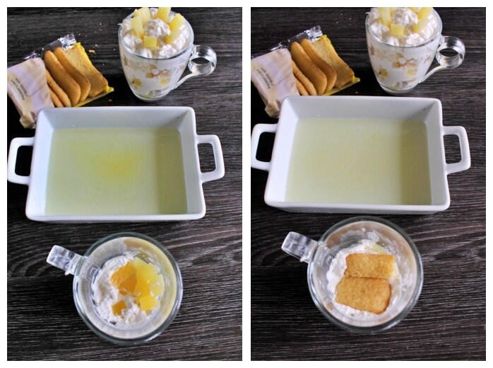 Ensuite, prenez les coupes, recouvrez environ 1/3 de crème au mascarpone, puis ajoutez à la crème 8 – 9 morceaux d’ananas (ne les essuyez pas du jus, ils rendront la crème encore plus savoureuse), puis imbibez 1-2 morceaux de pavesini (ou boudoirs) dans le jus d’ananas et posez-les sur la crème.