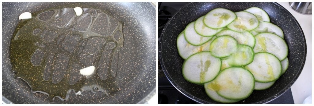 Chauffez dans une grande poêle l’huile d’olive extra vierge avec une gousse d’ail, placez les courgettes (pas toutes en même temps, mais un peu à la fois) et faites-les cuire environ 2 – 3 minutes, en les remuant délicatement avec une spatule de cuisine. Étant fines, cela ne prend pas beaucoup de temps.