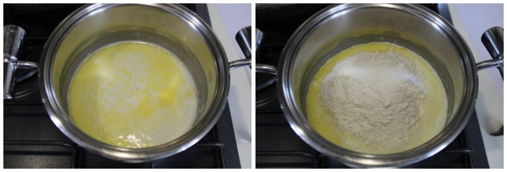 En attendant, préparez la béchamel. Dans une casserole à fond épais, faites fondre à feu doux le beurre; ajoutez la farine et mélangez vigoureusement avec un fouet, jusqu’à ce qu’elle commence à faire des bulles et devienne de couleur noisette (le fameux roux).