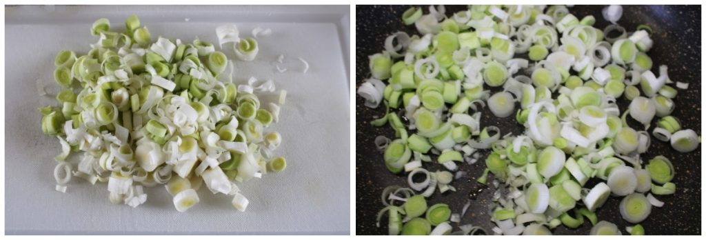 Tout d’abord, nettoyez les poireaux, en éliminant les racines, les feuilles extérieures et la partie verte plus dure (gardez-la de côté, elle vous servira pour faire la Velouté de Chou-fleur avec Pommes de Terre et Poireaux). Lavez-les et ensuite séchez-les avec un torchon propre. Coupez les poireaux en rondelles fines et mettez-les dans une poêle antiadhésive avec un filet d’huile d’olive extra vierge, avec l’oignon finement haché.