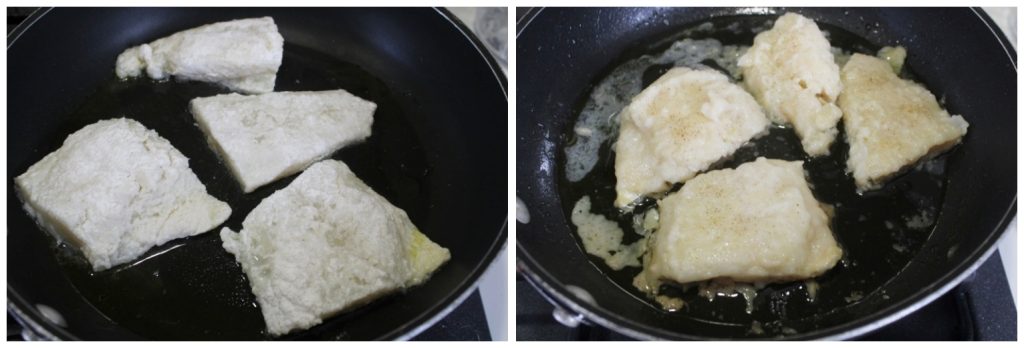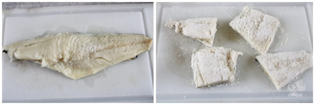 Entre-temps, farinez les filets de cabillaud (coupez-les en morceaux s’ils sont trop grands), secouez-les pour éliminer l’excès de farine