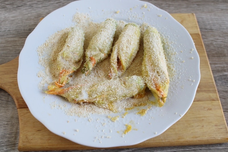 La préparation est très simple. Après avoir nettoyé délicatement les fleurs, je les ai farcies d’un cœur crémeux de burrata, que j’ai mélangé avec les anchois hachés. Ensuite, je les ai panées et frites, jusqu’à les rendre incroyablement croustillantes. Délicieuses. Un croc en appelle un autre!