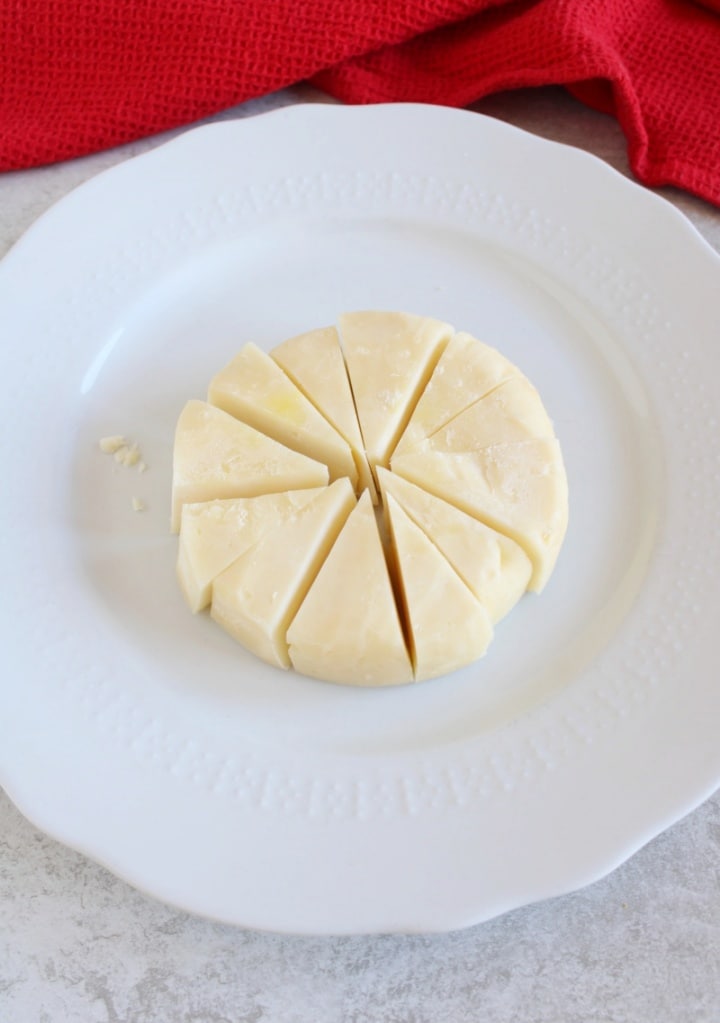 Pour commencer, coupez le fromage en tranches. S’il était trop frais, laissez-le sécher dans un endroit frais et sec pendant quelques jours, en le retournant de temps en temps et en le couvrant avec un essuie-tout. Pas de plastique, sinon il ne respirerait pas et moisirait.