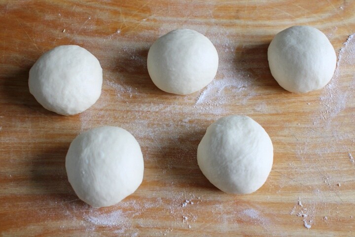 Une fois la pâte prête, divisez-la en 4 – 5 pâtons, que vous allez ensuite rouler pour former des boules, selon si vous les voulez plus grandes ou plus petites. J’en ai fait 5 pesant environ 128 g chacune.