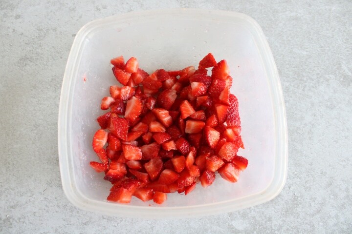 Pendant que les œufs montent, lavez les fraises, coupez-les en morceaux dans un bol, saupoudrez-les avec une poignée de sucre de canne et réservez.