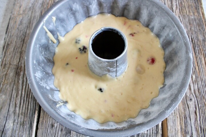 Une fois le temps écoulé, réduisez la vitesse du robot et ajoutez petit à petit le yaourt et l’huile, le zeste de citron, et enfin la farine, une pincée de sel et la fécule de pommes de terre tamisée avec la levure. Mélangez bien la préparation et ajoutez les mûres et les framboises, en mélangeant délicatement avec une spatule.