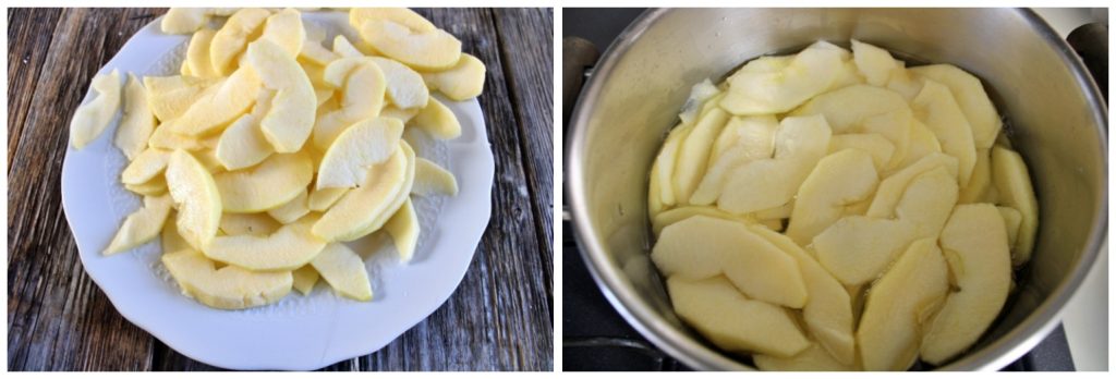 • Tout d’abord, épluchez les pommes, pelez-les et coupez-les en tranches assez fines. Pendant ce temps, mettez dans une casserole l’eau et le sucre et portez à ébullition pour obtenir un sirop. À ce stade, ajoutez les pommes coupées et faites cuire encore quelques minutes pour ramollir le fruit.