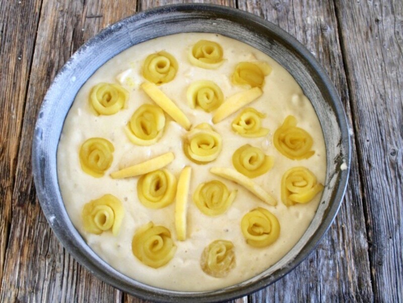 • Formez les roses avec les tranches de pomme, en commençant par le centre, en les enroulant délicatement et ensuite, déposez-les sur le gâteau. Enfournez dans le four déjà chaud pendant environ 30 – 35 minutes. Faites toujours le test du cure-dent. Il m’a fallu 37 minutes.