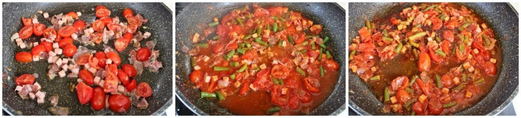 • Ensuite, lavez les tomates cerises, coupez-les en quartiers et ajoutez-les dans la poêle avec la sauce, versez 1 louche d’eau de cuisson, salez légèrement et couvrez avec un couvercle : laissez cuire pendant environ 10 minutes. Lorsque environ 3 minutes avant la fin de la cuisson, ajoutez également les haricots verts coupés en morceaux.