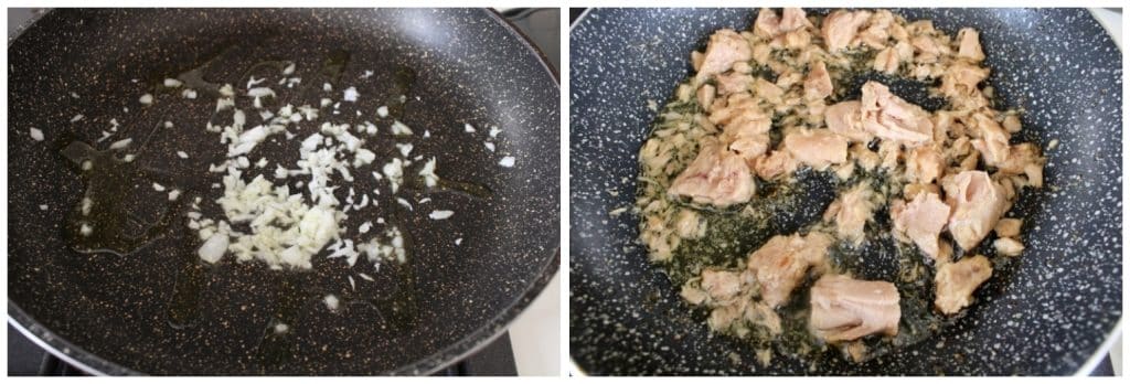 Faites chauffer 3 cuillères de huile d’olive extra vierge dans une poêle antiadhésive assez grande, ajoutez l’oignon finement haché avec un hachoir à corde (pratique et très rapide), et faites-le dorer. Ensuite, ajoutez le thon et laissez-le s’imprégner pendant quelques minutes.