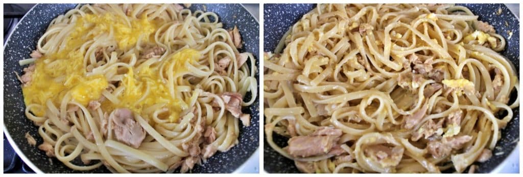 C’est pratiquement une sorte de carbonara, revisitée : j’ai simplement remplacé le lard par du thon et pour la crème d’œufs et fromage, j’ai utilisé des œufs entiers, au lieu de seulement les jaunes.