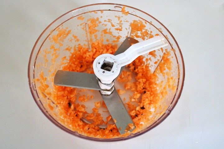 • Ensuite, hachez finement la carotte (si vous le souhaitez aussi le céleri) et ajoutez-la au hachis d’oignon, avec les légumes en dés, assaisonnez avec le thym, un peu de sel et une pincée de piment (si vous aimez), et faites revenir quelques minutes à feu vif.