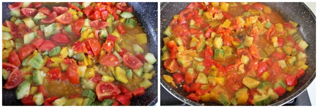 • Puis, baissez le feu et laissez cuire environ 10 minutes en remuant de temps en temps, si nécessaire ajoutez une louche d’eau de cuisson des pâtes, puis ajoutez aussi les tomates cerises coupées en deux ou en quartiers, le concentré de tomate et laissez cuire encore 8 – 9 minutes.