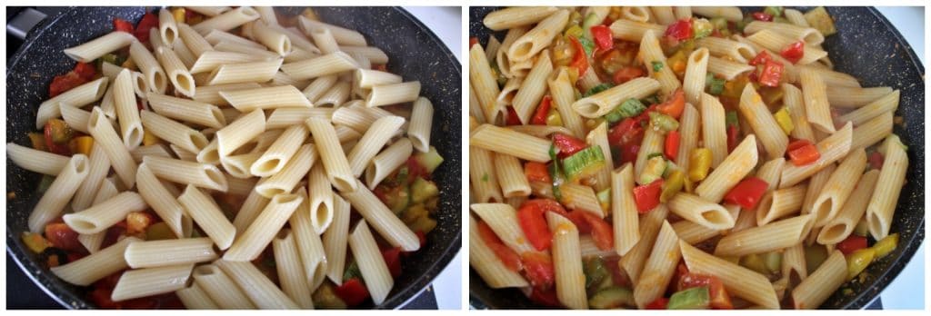 • Pendant ce temps, mettez une casserole avec beaucoup d’eau sur le feu et portez à ébullition. Lorsque l’eau bouillonne, ajoutez la forme de pâtes courtes que vous préférez (moi les penne au farro) et faites-les cuire au moins 9-10 minutes (selon les indications sur l’emballage).