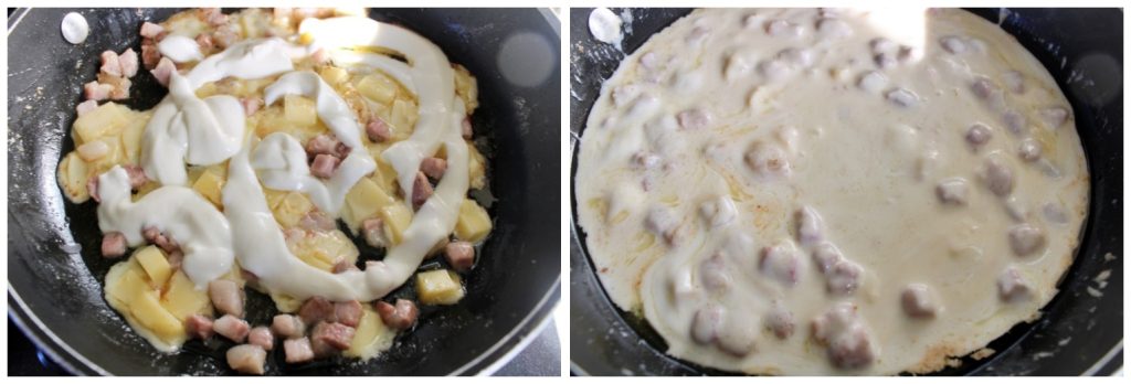 • Quand il reste quelques minutes avant la fin de la cuisson des pâtes, ajoutez la fontina coupée en dés et laissez-la fondre doucement, en vous aidant d’une cuillère en bois, puis ajoutez également la mozzarella coupée en petits morceaux, le parmesan et la crème et enfin 2 cuillères à soupe de sauce tomate déjà prête, pour donner un aspect plus coloré.