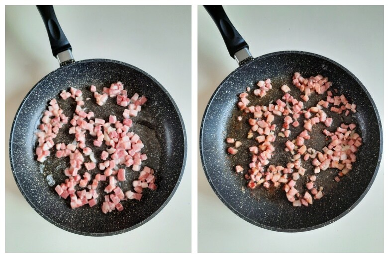 Pendant ce temps, dans une poêle antiadhésive, ajoutez un filet d’huile d’olive extra vierge et l’oignon finement haché. Laissez revenir à feu doux jusqu’à ce que l’oignon soit doré et transparent. Ajoutez la pancetta, augmentez légèrement le feu et faites-la revenir jusqu’à ce qu’elle soit croquante et dorée.