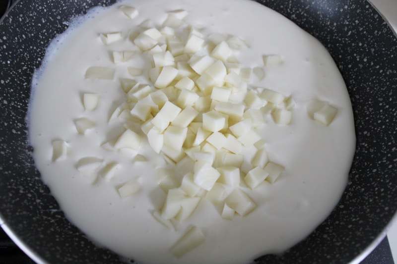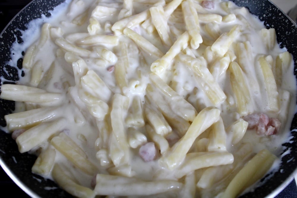 Retirez la pancetta et mettez-la de côté. Dans la même poêle, à feu doux, versez la crème de cuisine. Coupez la scamorza en petits dés et ajoutez-la à la crème ; mélangez jusqu’à ce que la scamorza soit complètement fondue, créant une sauce crémeuse et filante. Éteignez le feu et ajoutez la pancetta.