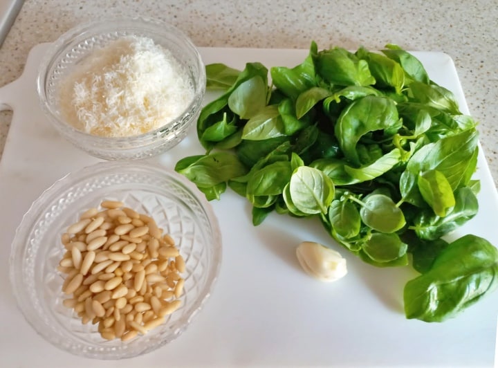 Facile et rapide, il ne faut que quelques ingrédients pour un résultat délicieux : une poignée de feuilles de basilic frais, de l’huile d’olive extra vierge, des pignons de pin, du parmesan reggiano, du pecorino et une gousse d’ail (sans le germe, pour une meilleure digestibilité – si on aime).